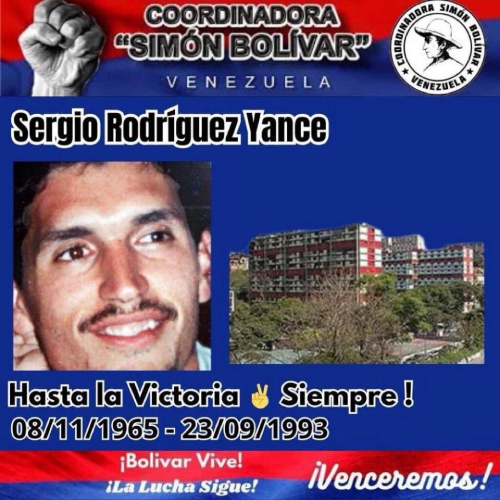 Sergio Rodríguez, nace el 8 de noviembre de 1965, es asesinado el 23 de septiembre de 1993, fue un poeta, deportista, trabajador social, estudiante de Sociología en la UCV, revolucionario y militó en el Movimiento de la Desobediencia Popular, junta al camarada Carlos Lanz Rodríguez.