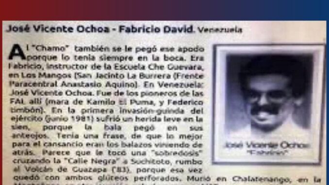 José Vicente Ochoa, nació el 4 de noviembre de 1956 en Caracas, Venezuela 🇻🇪, cae en un operativo militar en la montaña, Chalatenango, El Salvador 🇸🇻, el 8 de marzo de 1988, seudónimo Fabricio fue su nombre de combate en homenaje a Fabricio Ojeda, periodista, diputado y activista venezolano que luchó contra la dictadura de Marcos Pérez Jiménez.