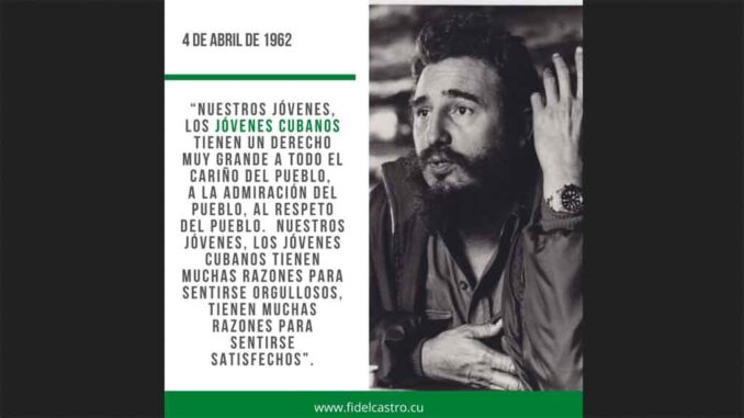 Porque, como afirmó Fidel Castro el 4 de abril de 1962, “creer en los jóvenes es ver en ellos, además de entusiasmo, capacidad; además de energía, responsabilidad; además de juventud, ¡pureza, heroísmo, carácter, voluntad, amor a la Patria, fe en la Patria! ¡Amor a la Revolución, fe en la Revolución, confianza en sí mismos, convicción profunda de que la juventud puede, de que la juventud es capaz, convicción profunda de que sobre los hombros de la juventud se pueden depositar grandes tareas!”.