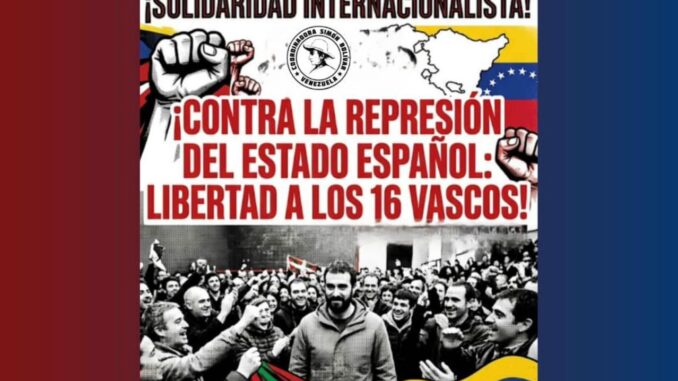 Desde las trincheras del combate popular en Caracas, Venezuela, donde el fuego de la Revolución Bolivariana se mantiene encendido, la Coordinadora Simón Bolívar levanta su bandera internacionalista para abrazar la lucha histórica del Pueblo Vasco. Alzamos nuestra voz de denuncia y combate frente a la nueva arremetida de ese aparato de tortura jurídica que es el Estado monárquico español, que hoy pretende sentar en el banquillo de los acusados a 16 compañeros y compañeras por el simple y sagrado delito de la solidaridad humana.